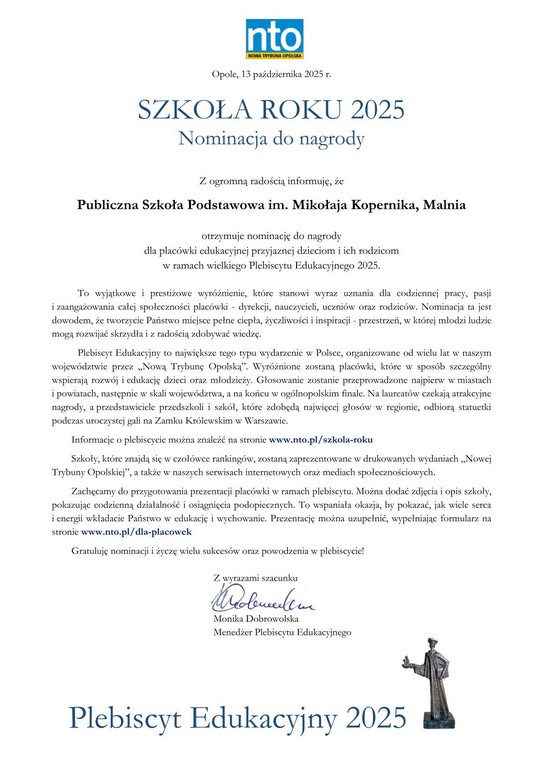 Drodzy Uczniowie i Rodzice! Już dziś bardzo dziękujemy za Wasze nominacje. To dla nas ogromny zaszczyt