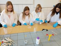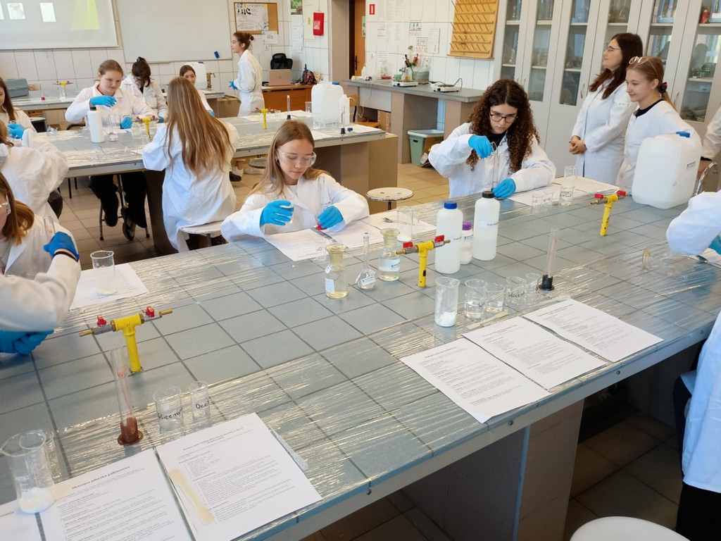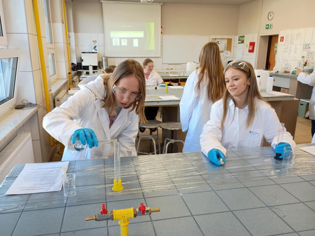 W dniu 31 października 2025 r., uczennice klasy 8 wzięły udział w warsztatach chemicznych w Zespole Szkół w Opolu na ulicy Struga 16a, czyli popularnym „Staszicu”. Przez dwie godziny uczniowie wykonali trzy doświadczenia – wytwarzanie biodegradowalnego plastiku ze skrobi ziemniaczanej, zastosowanie szkła wodnego do oczyszczania wody z metali ciężkich, skacząca piłeczka polimerowa. Wszystkie doświadczenia zakończyły się sukcesem, najwięcej zabawy było z piłeczką, która odbijała się od powierzchni jakby była z kauczuku. Była to dobra okazja nie tylko na poznanie opolskiej szkoły ponadpodstawowej, ale przede wszystkim praktyczne poznanie chemii na poziomie szkoły średniej, wykazanie się samodzielnością – pomocą służyły uczennice ze „Staszica”, poznanie jak wygląda pracownia chemiczna, których jest kilka na terenie szkoły. Warsztaty przyniosły wzrost zainteresowania chemią, był to czas mile i pracowicie wykorzystany, przybliżył też problem odpadów, sposobami walki z zagrożeniami skażenia środowiska.
