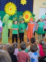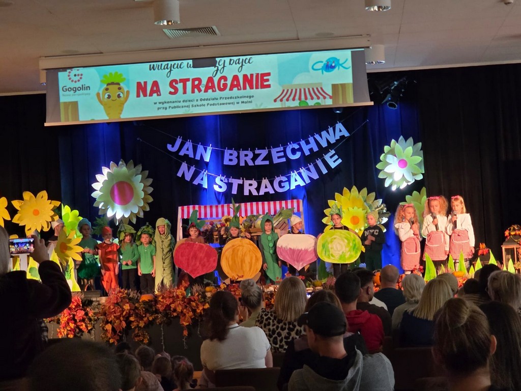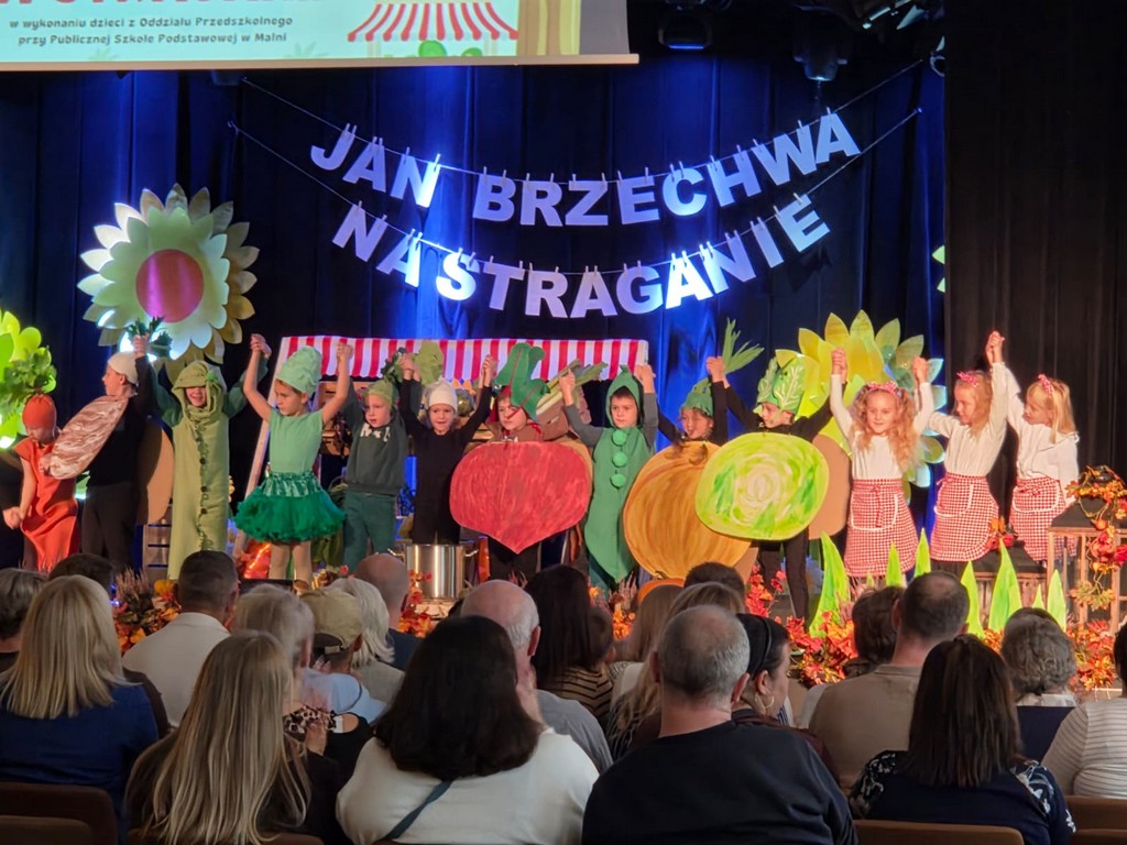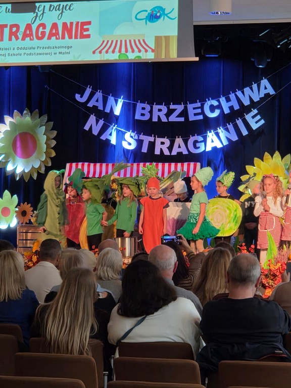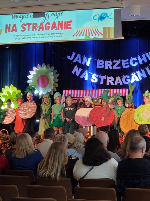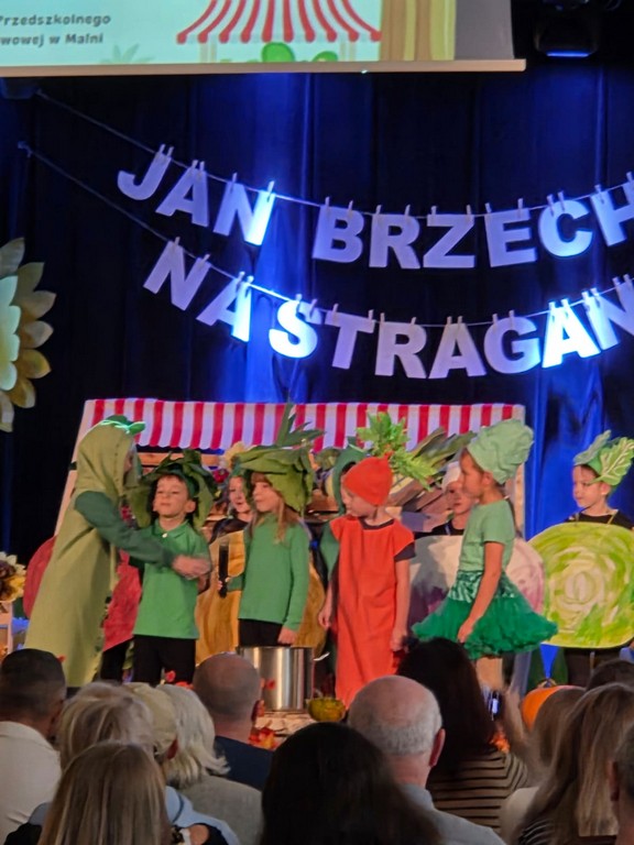 Przedstawienie było pełne radości, kolorów i energii. Mali aktorzy wcielili się w role sprzedawców i sprzedawanych warzyw, odtwarzając scenki z życia straganu. Dzieci z dużym zaangażowaniem recytowały wiersz, odgrywały role z uśmiechem na twarzy, co sprawiło, że publiczność była zachwycona.