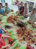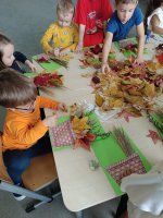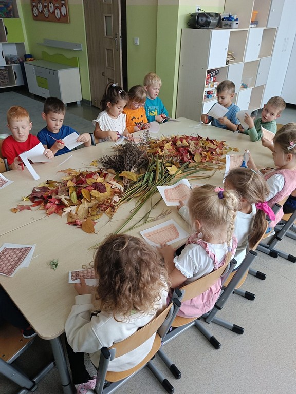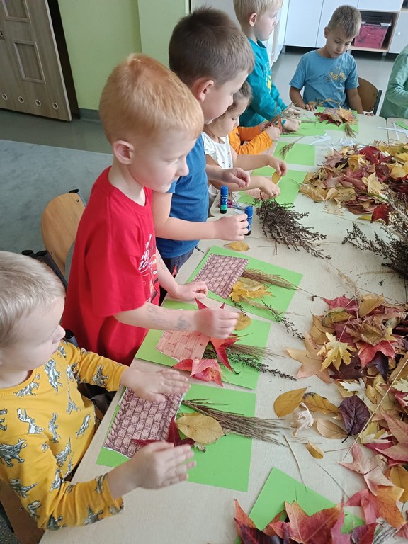Po powrocie do przedszkola mali artyści przystąpili do działania. Zebrane skarby natury zamieniły się w piękne jesienne bukiety. Dzieci z zapałem układały liście według kolorów, tworzyły kompozycje przypominające kwiatowe wiązanki.