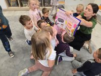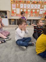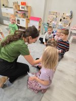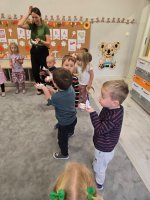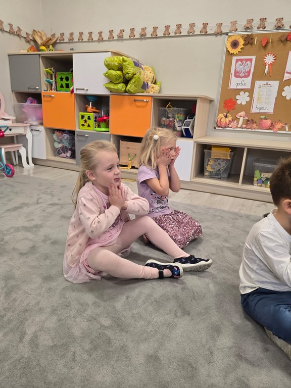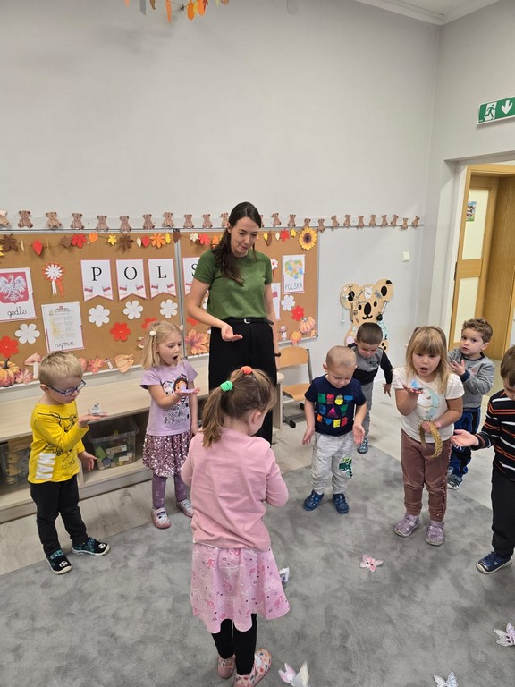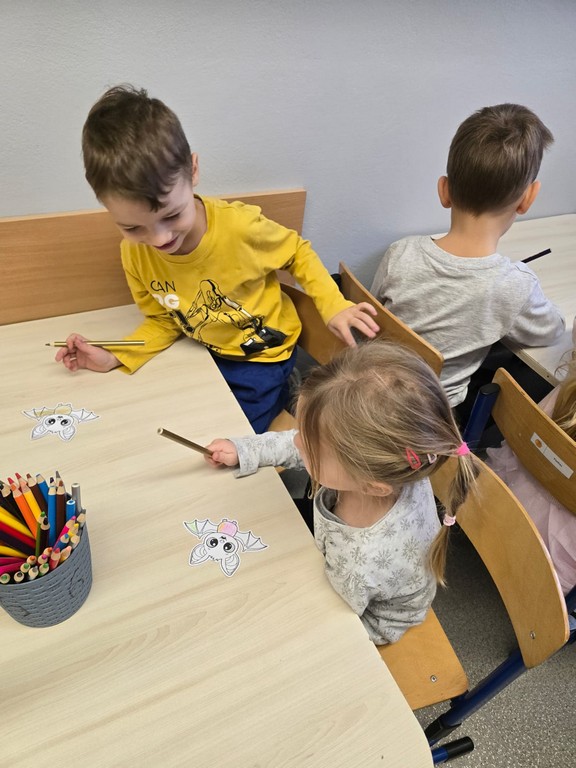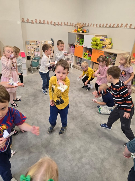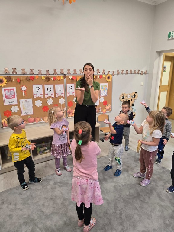 W najmłodszej grupie przedszkolnej „Misie” odbyły się zajęcia logopedyczne inspirowane książką „Nietoperz Nocek”. Pod okiem pani logopedy maluchy wykonywały różnorodne ćwiczenia buzi, języka i oddechu – dmuchały na piórka, „parskały jak konik” oraz robiły „baloniki z policzków”. Wszystko przebiegało w formie radosnej zabawy, dzięki czemu dzieci rozwijały prawidłowy tor oddechowy oraz umiejętności mowy.