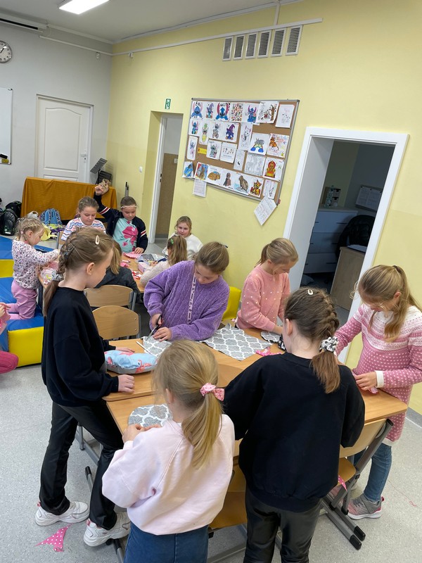 Szycie to bardzo ważna i potrzebna umiejętność. Podczas zajęć świetlicowych dzieci często sięgają po igły i nici. Powstał pomysł stworzenia własnej poduszki, w kształcie serca. Uczniowie z wielkim zaangażowaniem podeszli do tematu. Uszyte podusie każdy zabrał do domu.
