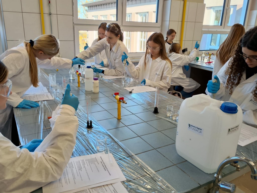 W dniu 31 października 2025 r., uczennice klasy 8 wzięły udział w warsztatach chemicznych w Zespole Szkół w Opolu na ulicy Struga 16a, czyli popularnym „Staszicu”. Przez dwie godziny uczniowie wykonali trzy doświadczenia – wytwarzanie biodegradowalnego plastiku ze skrobi ziemniaczanej, zastosowanie szkła wodnego do oczyszczania wody z metali ciężkich, skacząca piłeczka polimerowa. Wszystkie doświadczenia zakończyły się sukcesem, najwięcej zabawy było z piłeczką, która odbijała się od powierzchni jakby była z kauczuku. Była to dobra okazja nie tylko na poznanie opolskiej szkoły ponadpodstawowej, ale przede wszystkim praktyczne poznanie chemii na poziomie szkoły średniej, wykazanie się samodzielnością – pomocą służyły uczennice ze „Staszica”, poznanie jak wygląda pracownia chemiczna, których jest kilka na terenie szkoły. Warsztaty przyniosły wzrost zainteresowania chemią, był to czas mile i pracowicie wykorzystany, przybliżył też problem odpadów, sposobami walki z zagrożeniami skażenia środowiska.