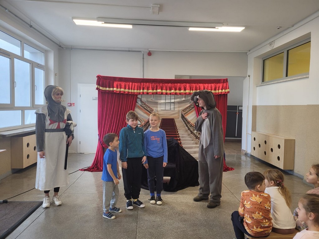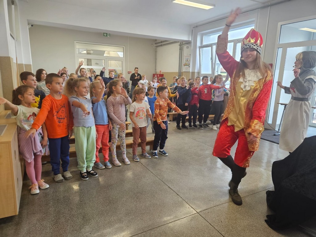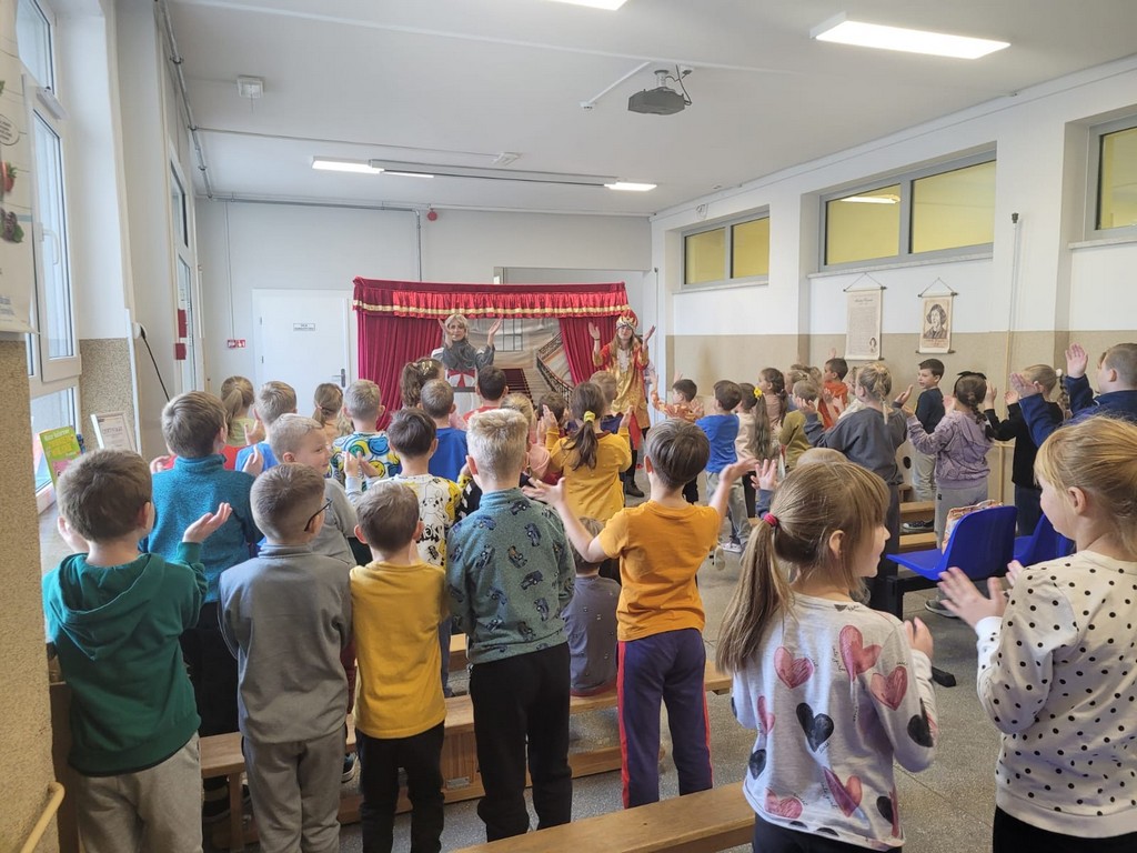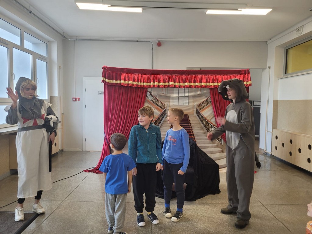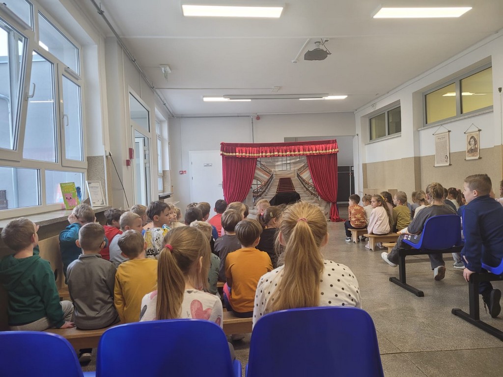 W czwartek, 23 października, w naszej szkole gościł Teatr Kurtyna z Krakowa, który zaprezentował trzy spektakle profilaktyczne dla różnych grup wiekowych. Uczniowie klas VII–VIII obejrzeli przedstawienie „Influencerka”, poruszające temat depresji, hejtu i iluzji świata wirtualnego. Dla klas IV–VI przygotowano spektakl „Pozorna gra”, ukazujący zagrożenia wynikające z uzależnień od internetu i gier komputerowych. Najmłodsze dzieci – przedszkolaki i uczniowie klas I–III – uczestniczyły w bajce profilaktycznej „Tajemnica zaginionych książek”, uczącej, czym jest zdrowy styl życia, przyjaźń i odpowiedzialność.