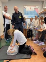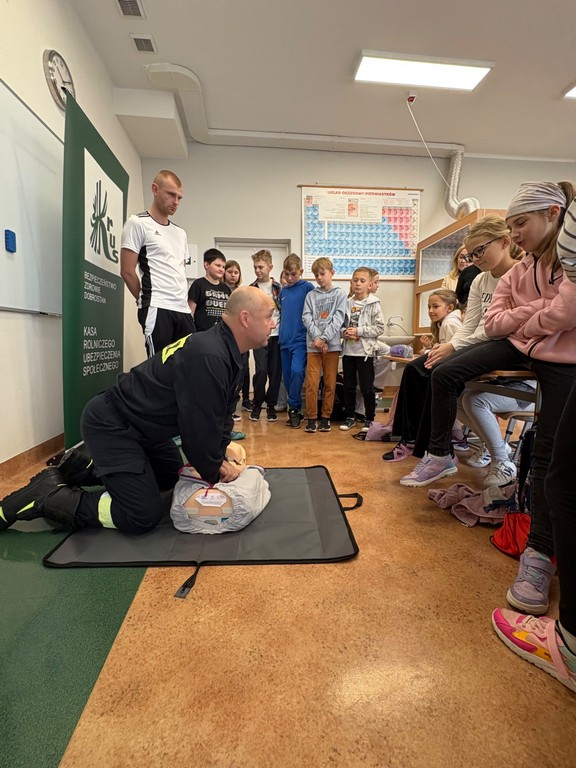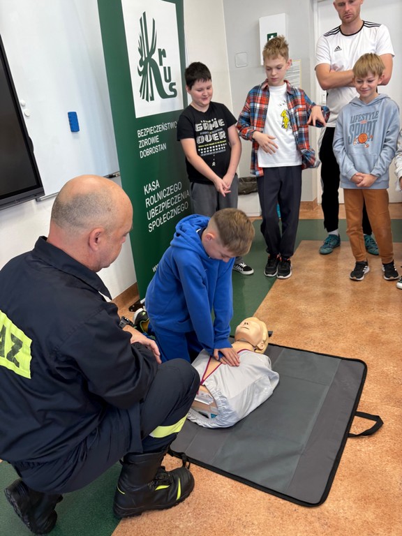 Drugi etap spotkania poprowadził pracownik Straży Pożarnej, który wskazał dzieciom jak zachować się w sytuacji zagrożenia, jakie podjąć wówczas działania i w jaki sposób powiadomić właściwe służby. Najciekawsze dla uczniów okazało się szkolenie z udzielania pierwszej pomocy. Każdy mógł poćwiczyć na fantomie treningowym masaż serca oraz ułożyć „poszkodowanego” w pozycji bezpiecznej.