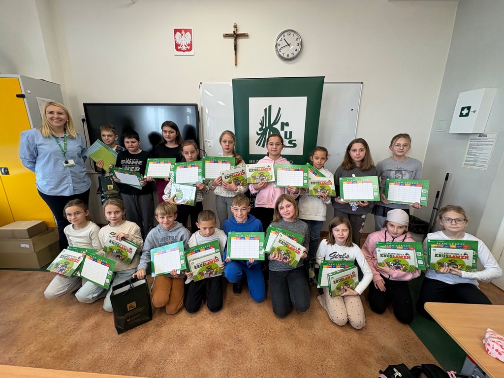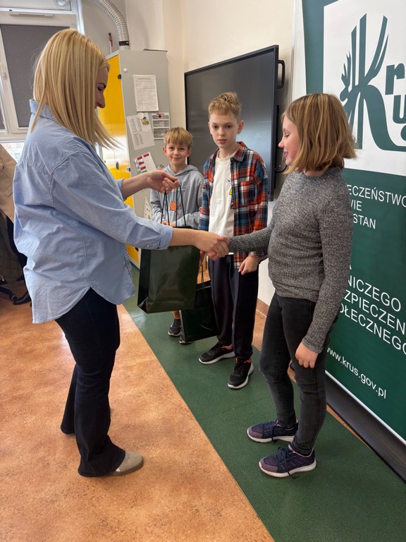 W miniony czwartek uczniowie klasy 4 uczestniczyli w bardzo ciekawej pogadance dotyczącej bezpieczeństwa w gospodarstwie rolnym. Spotkanie poprowadziły panie ze Strzeleckiego Oddziału Kasy Rolniczego Ubezpieczenia Społecznego wraz z pracownikiem Straży Pożarnej. Dzieciom przedstawiono film edukacyjny z ważnymi informacjami promującymi pozytywne zachowania związane z pracą i zabawą dzieci na terenie gospodarstwa rolnego. Uczniowie wzięli także udział w konkursie z nagrodami pt. „Zasady BHP na wsi znamy - wypadkom szans nie damy”