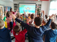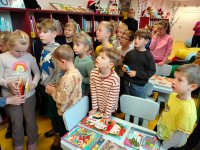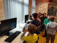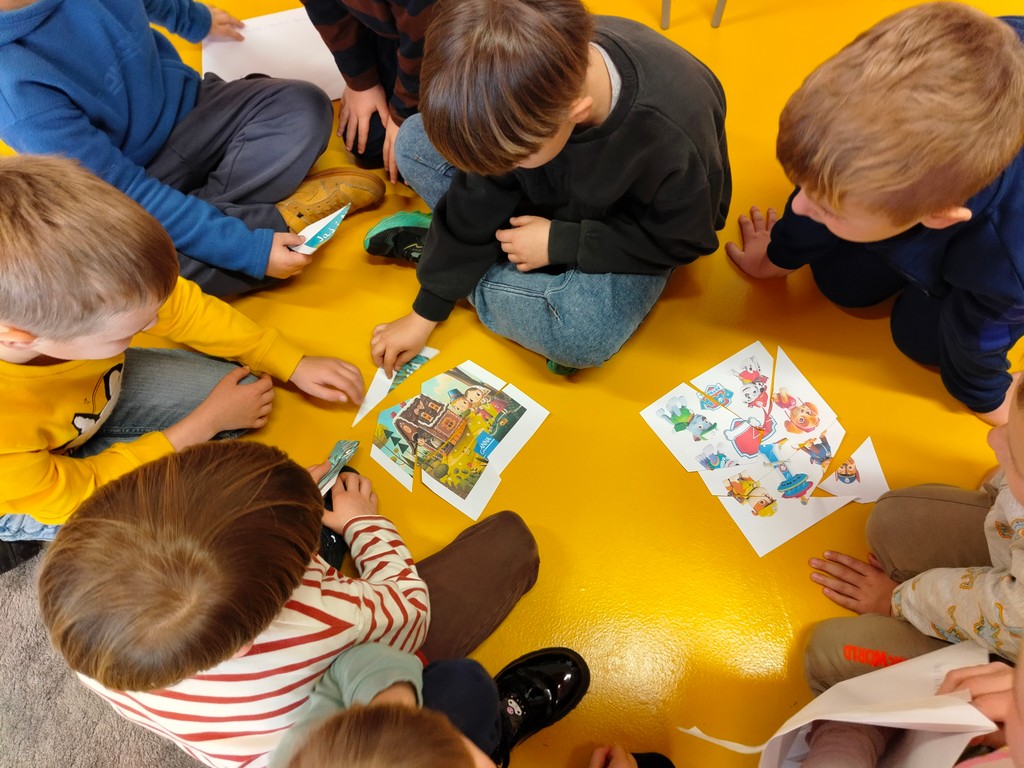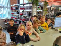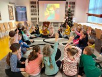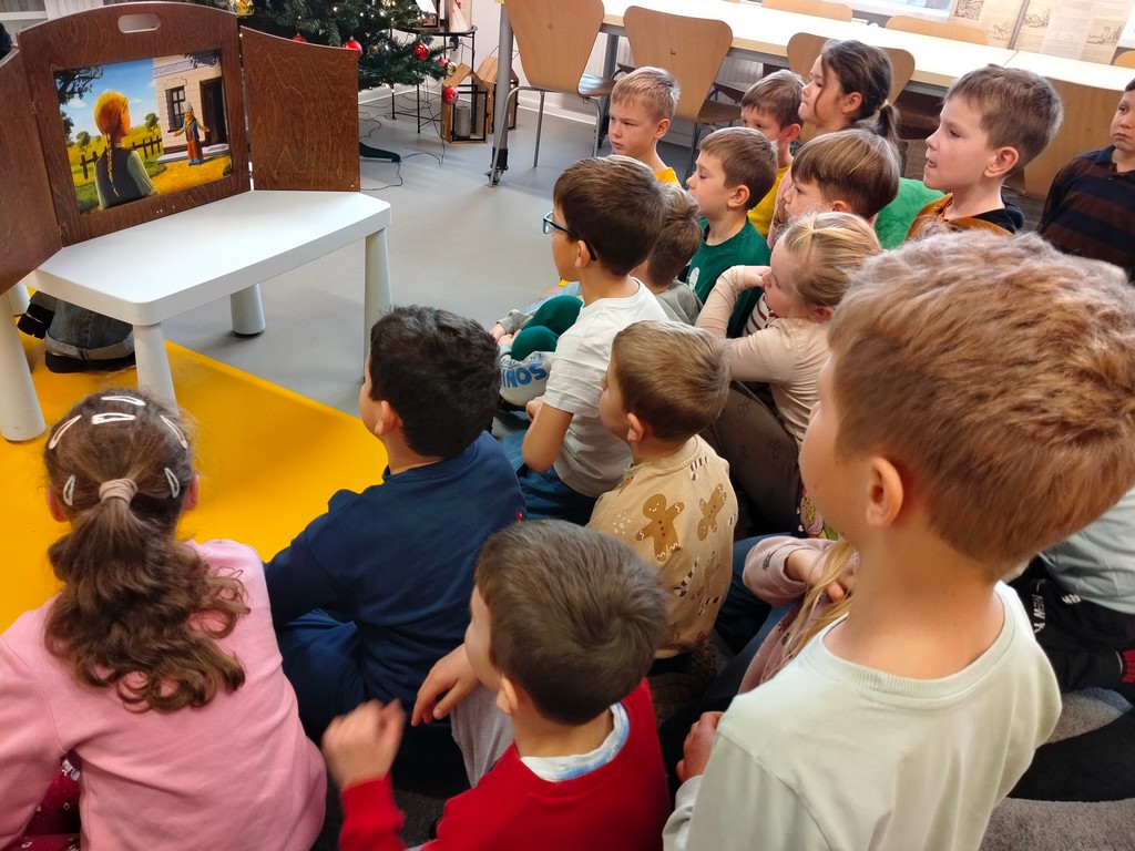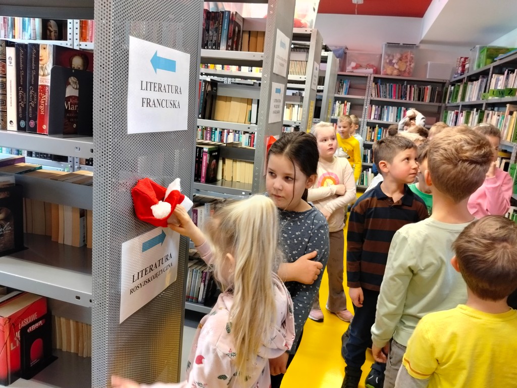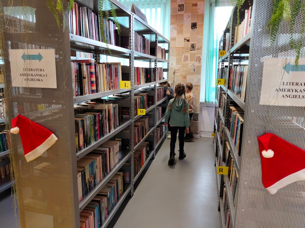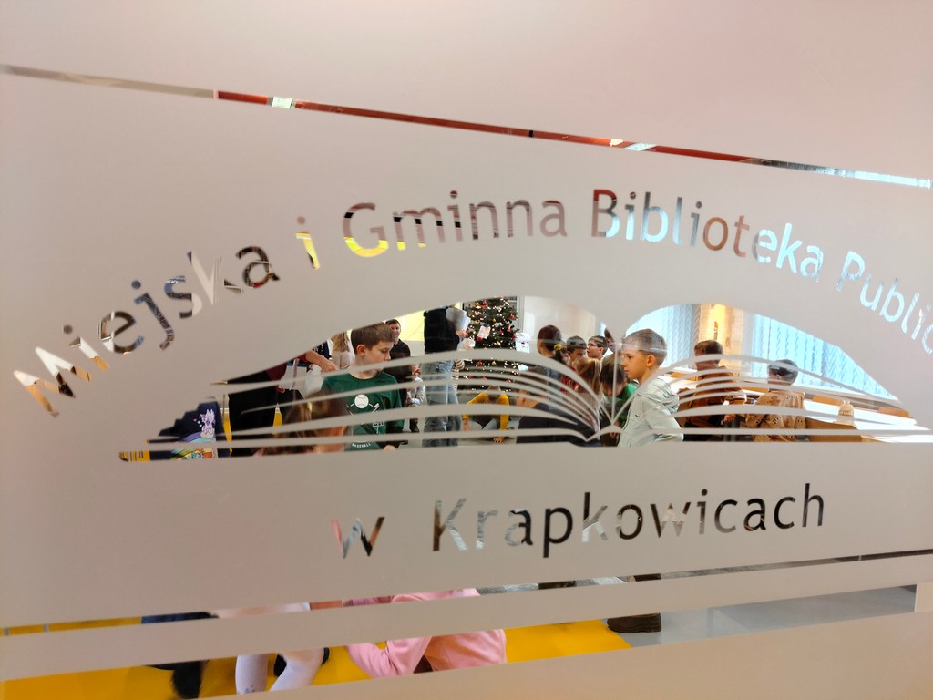 W dniu 9 grudnia 2025 r. uczniowie klasy I odwiedzili Miejsko-Gminną Bibliotekę Publiczną w Krapkowicach. Celem wycieczki było zapoznanie z bogatym księgozbiorem dla dzieci i dorosłych, zasadami wypożyczania książek, audiobooków oraz płyt CD. Uczniowie mieli możliwość przespacerowania się między regałami, by poczuć ilość książek na półkach. Krapkowicka biblioteka to nie tylko zbiory biblioteczne, uczniowie poznali to miejsce jako przyjazne czytelnikowi. Spotkaliśmy tutaj ciekawie zaaranżowany kącik czytelniczy oraz salę do zabaw, kolorowe pufy, świąteczne ozdoby wykonane z książek. Panie bibliotekarki przygotowały konkursy czytelnicze, w których można było sprawdzić swoją wiedzę z tematyki bajek i baśni. Ciekawostką, która szczególnie zainteresowała uczniów, był teatrzyk Kamishibai. To teatr jednego lektora, który czytając, przedstawia opowieść za pomocą kart narracyjno-obrazkowych. Na zakończenie zajęć uczniowie otrzymali zadanie odnalezienia pięciu chochlików na muralu budynku bibliotecznego, z czym poradzili sobie bardzo szybko. Każde dziecko, które chciałoby zapisać się do biblioteki, by korzystać z dziecięcego księgozbioru musi przyjść z rodzicem, by otrzymać kartę czytelnika. To upoważnia to wypożyczania zbiorów zgodnie z regulaminem.