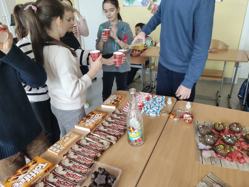 Jakiś czas temu klasa czwarta uczciła 50- tą lekcję matematyki. Z tej okazji uczniowie przygotowali tort i inne słodkości. Nie mogło obyć się bez szampana Picollo. Z niecierpliwością czekamy na kolejny powód do świętowania - setną lekcję!