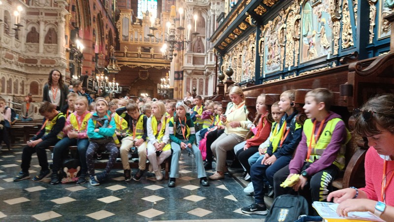W dniu 11 października 42 uczniów naszej szkoły wyruszyło wraz wychowawcami na wycieczkę do Krakowa. Swoją przygodę w poznawaniu miasta rozpoczęliśmy od spotkania z przemiłą panią przewodnik, która pięknie i obszernie opowiadała nam o najpiękniejszych zabytkach Krakowa. Zwiedzanie rozpoczęliśmy od placu Matejki, na którym znajduje się pomnik Grunwaldzki oraz Grób Nieznanego Żołnierza. Następnie udaliśmy się spacerkiem w stronę krakowskiego rynku mijając po drodze m.in. Barbakan, Bramę floriańską oraz dom Jana Matejki. Po przejściu urokliwej ulicy Floriańskiej dotarliśmy do Sukiennic, przy których zobaczyliśmy setki gołębi. To dopiero był widok! Na Starym Rynku mięliśmy również okazję usłyszeć Hejnał z wieży Kościoła Mariackiego, po którym pan grający na trąbce pomachał do nas z okna. Przy Sukiennicach mieliśmy czas na zakup pamiątek i drobnych upominków dla najbliższych (no bo to przecież konieczność!). Następnie pani przewodnik zaprosiła nas do wnętrza Kościoła Mariackiego i przekazała nam ogrom ciekawych informacji- usłyszeliśmy m.in. legendę o żółtej ciżemce. W kościele oddaliśmy się chwilowej zadumie podziwiając Ołtarz Wita Stwosza oraz malowidła pięknych aniołów stworzonych ręką samego Jana Matejki. Po pożegnaniu pani przewodnik, udaliśmy się na obiad. Po krótkim odpoczynku ruszyliśmy w stronę Smoczej Jamy, a Smok który jej pilnował zionął do nas ogniem. Uwierzycie?