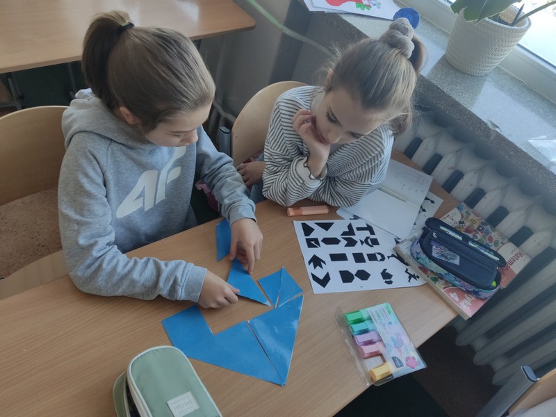 Tangram to chińska łamigłówka (układanka), znana od ok. 3000 lat. Składa się z siedmiu elementów w postaci figur geometrycznych, powstałych przez rozcięcie kwadratu. Celem jest odtworzenie położenia wszystkich siedmiu elementów tangramu w przedstawionym obrazku na podstawie jedynie kształtu jego konturów, a także wymyślanie własnych wzorów. Ma na celu ćwiczenie logicznego myślenia, percepcji wzrokowej, pamięci, wyobraźni oraz małej motoryki. Tangram to nie tylko świetna zabawa ale także genialna łamigłówka przydatna na lekcjach na każdym poziomie edukacji. Klasa czwarta spróbowała swoich sił, starając się ułożyć chociaż kilka wzorów.