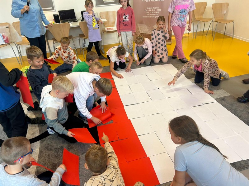 Uczniowie klasy pierwszej i drugiej dnia 6 listopada odwiedzili Miejską i Gminną bibliotekę na ulicy Adama Mickiewicza w Krapkowicach. Dzieci uczestniczyły w warsztatach na temat Święta Niepodległości. Panie pracujące w bibliotece stanęły na wysokości zadania, bo dzieci miały ogrom różnych zadań do wykonania na temat edukacji patriotycznej, m.in. układały flagę Polski z białych i czerwonych kartek, tańczyły do piosenek o Polsce, układały ,,Katechizm polskiego dziecka” z rozsypanki zdaniowej, sklejały puzzle tworząc jeden z symboli narodowych- polskie godło.