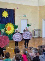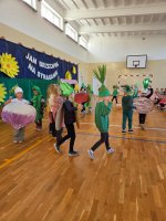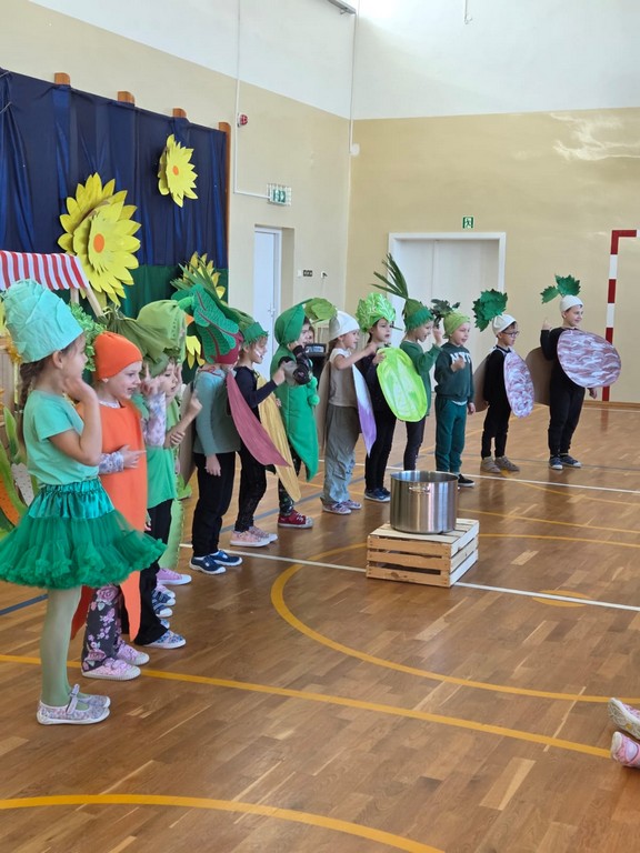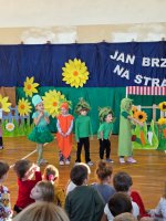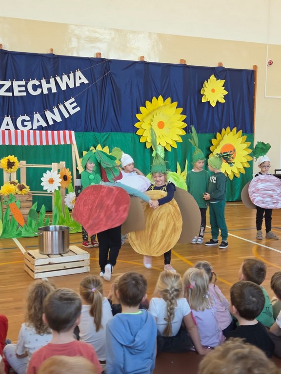 Przedstawienie było pełne radości, kolorów i energii. Mali aktorzy wcielili się w role sprzedawców i sprzedawanych warzyw, odtwarzając scenki z życia straganu. Dzieci z dużym zaangażowaniem recytowały wiersz, odgrywały role z uśmiechem na twarzy, co sprawiło, że publiczność była zachwycona.