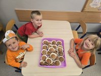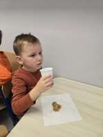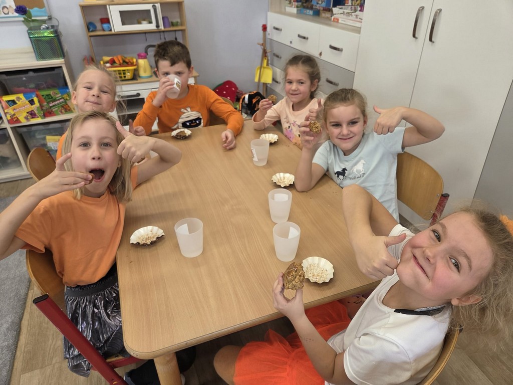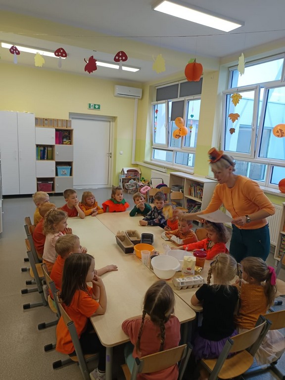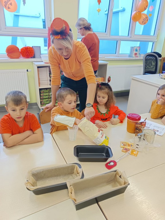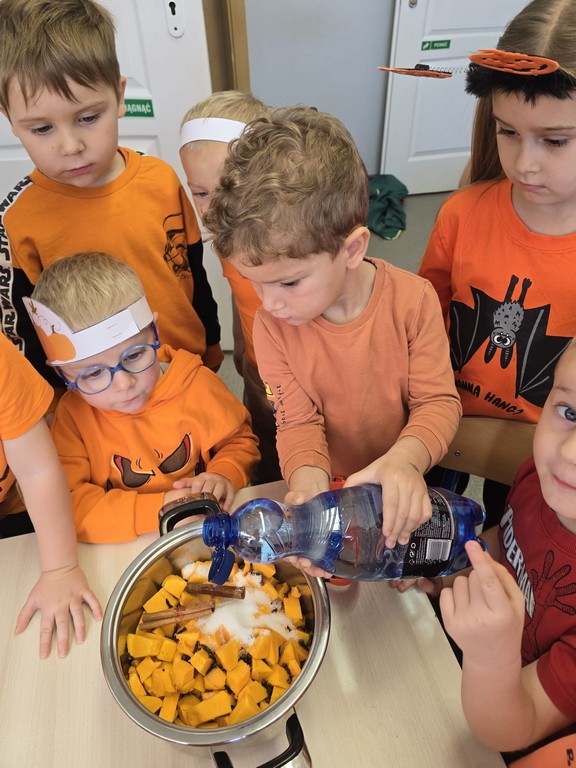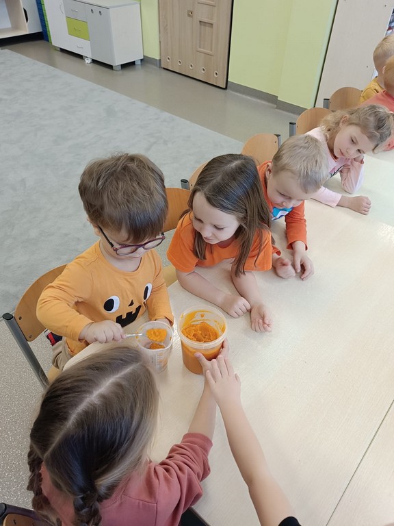 Kulminacyjnym punktem dnia były zabawy kulinarne. Przedszkolaki samodzielnie uczestniczyły w przygotowaniu ciasta dyniowego oraz kompotu z dyni. Z wielkim zaangażowaniem mieszały składniki, obserwując, jak powstają pyszne smakołyki. Na zakończenie dnia odbyła się degustacja dyniowych przysmaków.