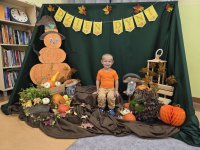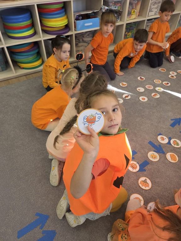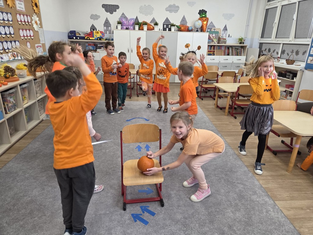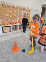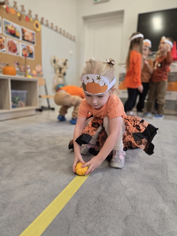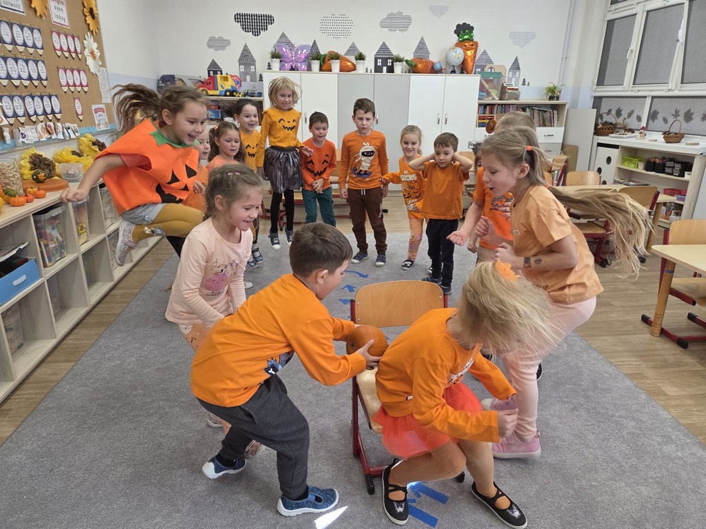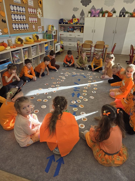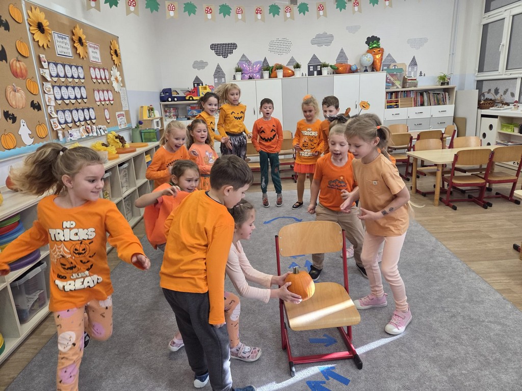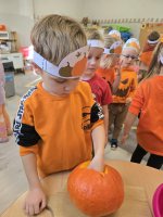 Już od rana w przedszkolu dominował kolor pomarańczowy. Dzieci przyszły ubrane w stroje w odcieniach dyni, a sale wypełniły się dekoracjami z liści, girland i oczywiście – z samych dyń!