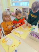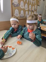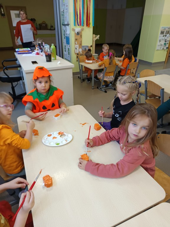 Nie zabrakło również zajęć plastycznych. Dzieci malowały gipsowe odlewy dyni, tworząc piękne i oryginalne prace, które ozdobiły przedszkolne sale. Każdy mały artysta mógł wykazać się pomysłowością i kreatywnością, a pomarańczowe dzieła wyglądały przepięknie!