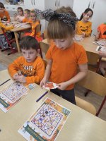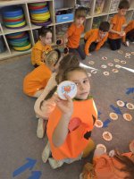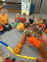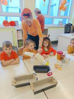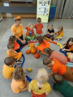 W ramach zajęć edukacyjnych dzieci przeliczały dynie, segregowały je według wielkości i koloru, a także badały ich wnętrze – sprawdzały, co kryje się w środku i z czego składa się to niezwykłe warzywo.