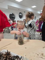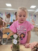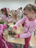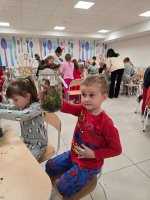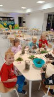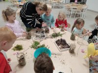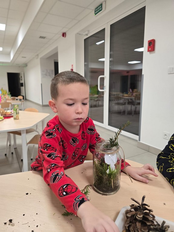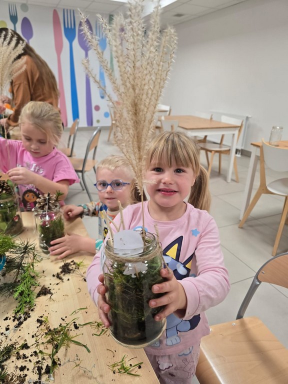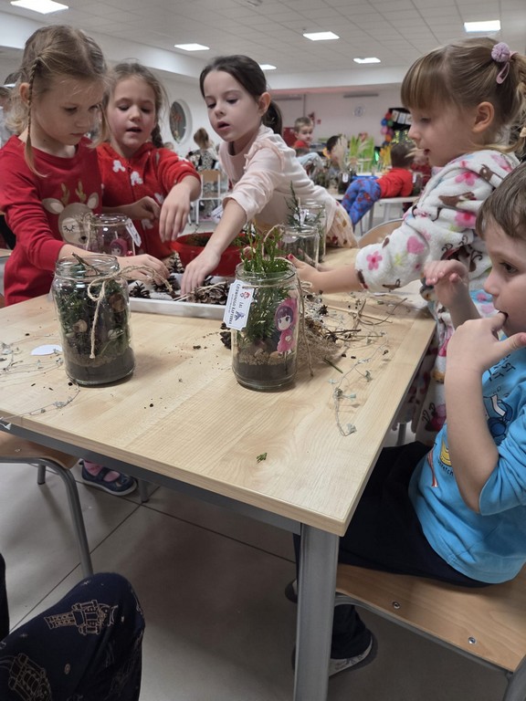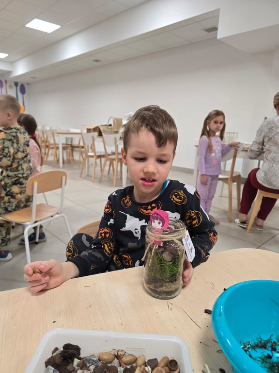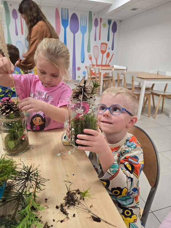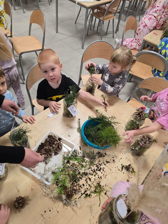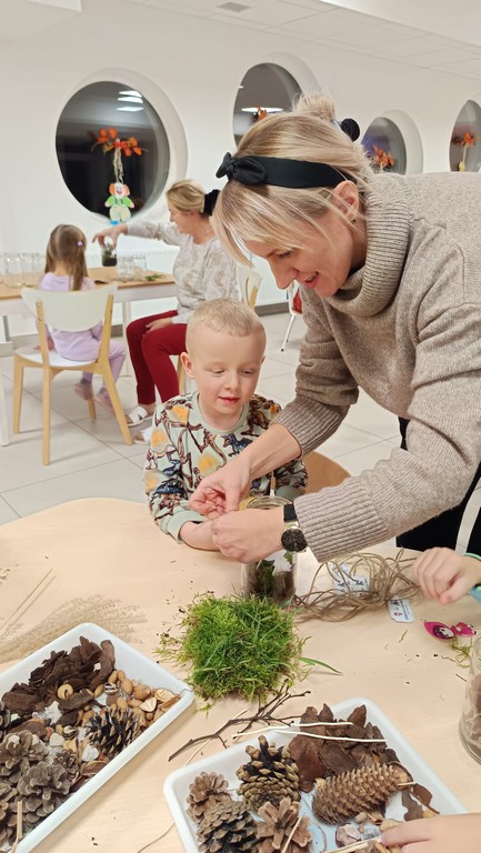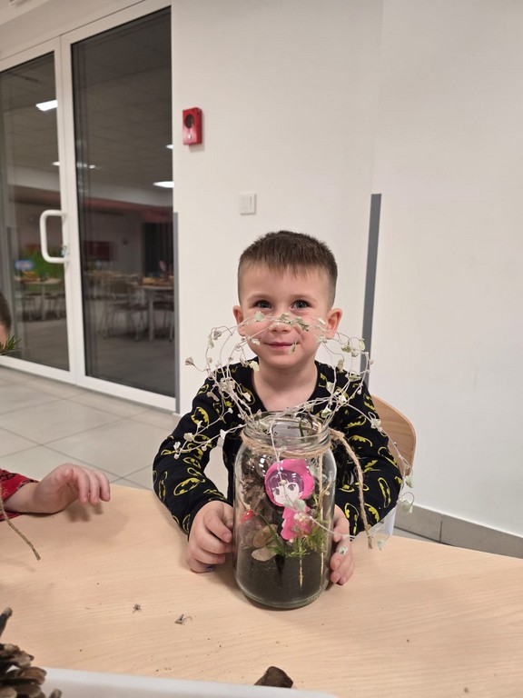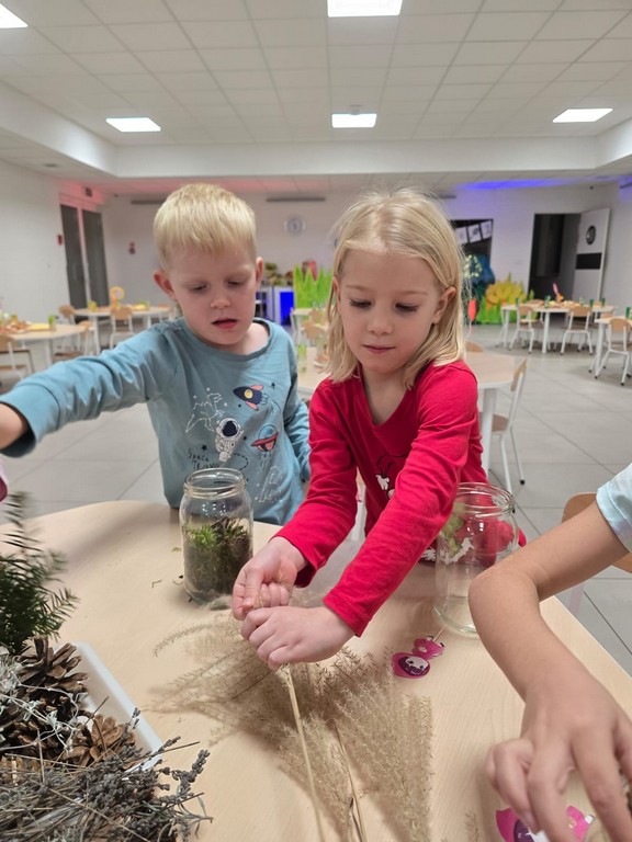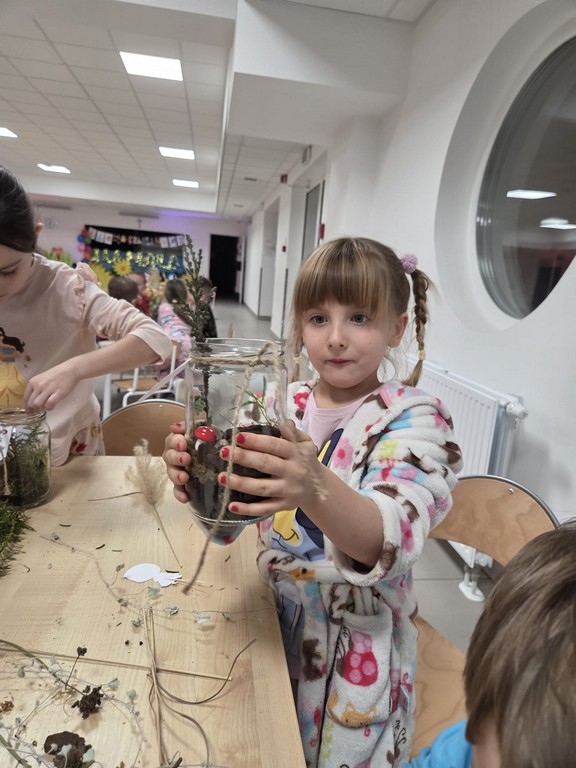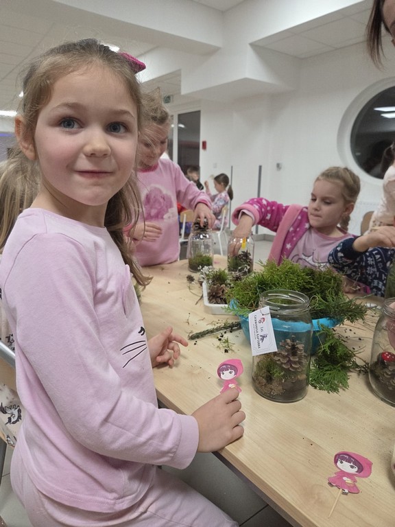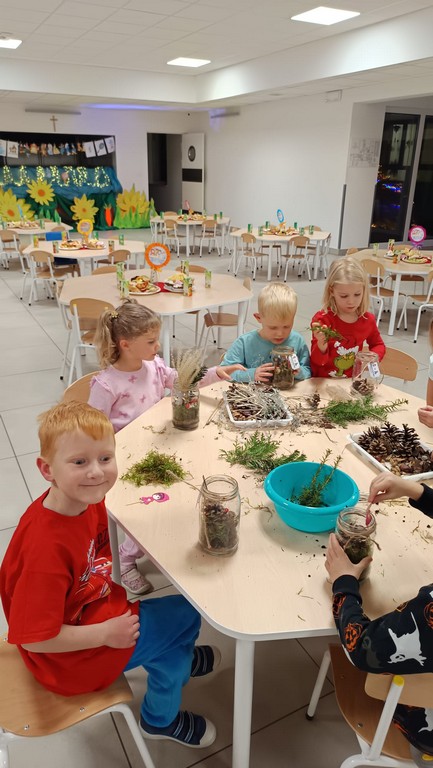 Podczas wieczoru przedszkolaki brały również udział w warsztatach kreatywnych – samodzielnie, wykorzystując materiały zebrane na spacerach, stworzyły Las Czerwonego Kapturka.
