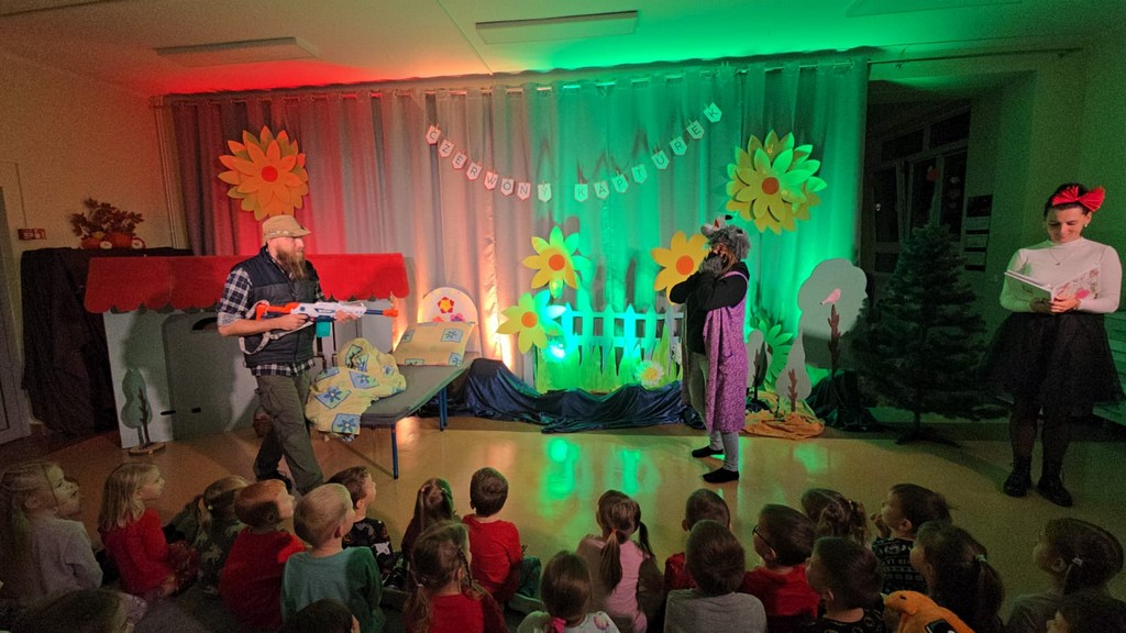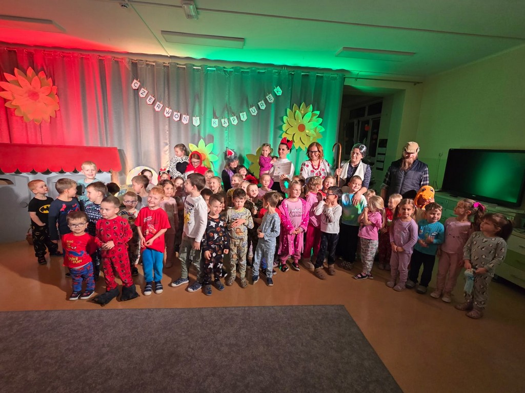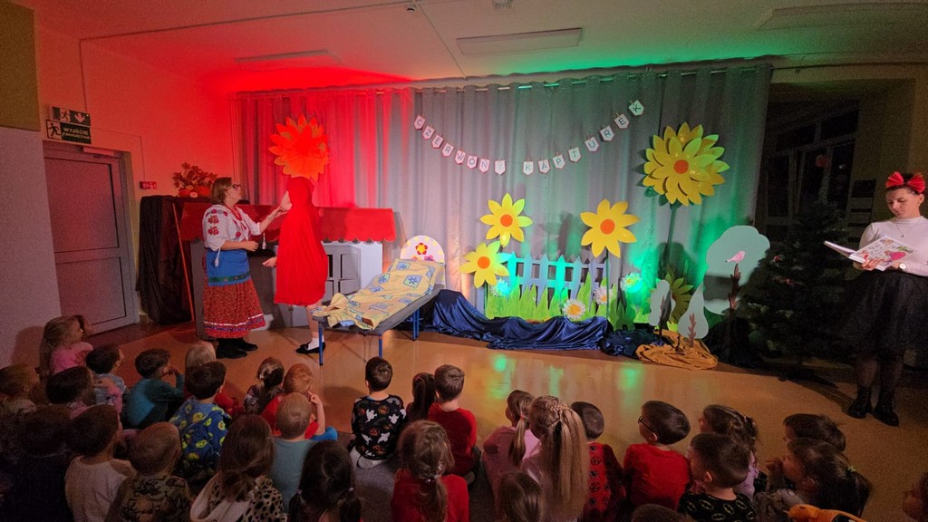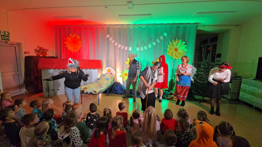 Na początku wieczoru udaliśmy się do sali „Motylków”, gdzie dzieci słuchały bajek czytanych przez panią Anię Szefer. Następnie przeszliśmy do sali „Biedronek”, gdzie rodzice przedszkolaków zaprezentowali przedstawienie „Czerwony Kapturek”. Występ dostarczył wiele radości, a mali widzowie nagrodzili go gromkimi brawami.