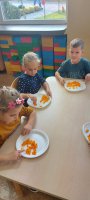 Kolejnym etapem, w którym dowiedzieliśmy się, jak dbać o zdrowie podczas jesiennej pogody były zajęcia o warzywach i sałatce jarzynowej. Na początku umyliśmy porządnie nasze rączki i przypomnieliśmy zasady, jak postępować z nożem. Później zabraliśmy się za krojenie. Gdy już wszystko było skończone, wystarczyło doprawić i wymieszać. I gotowe! Czas na jedzenie.