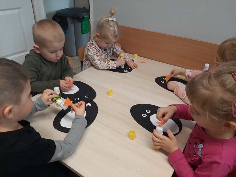 20 stycznia 2022r, grupa „MISIE” przeniosła się do Krainy Lodu, pełnej małych pingwinów. Małe pingwinki wspólnie się bawiły, tańczyły na lodzie, śpiewały i karmiły pingwina rybkami. Zgromadzone na ten dzień atlasy, albumy i książeczki wzbogacały wiedzę dotyczącą tego gatunku. Z ciekawością i dużą uwagą dowiadywaliśmy się o przygodach Pik-Poka. Wszyscy wspólnie zorganizowaliśmy "Marsz Pingwinów". Na koniec maluszki wykonały piękne pingwiny.