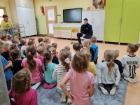 W ubiegłym tygodniu nasze przedszkole odwiedził pan policjant, który przybliżył dzieciom podstawowe zasady bezpiecznego poruszania się po drogach oraz przypomniał numery alarmowe. Największym zainteresowaniem cieszyła się prezentacja wyposażenia policyjnego, niezbędnego podczas wykonywania pracy policjanta. Dzieci dzieliły się także swoimi doświadczeniami, pokazały, że są odpowiedzialne i wiedzą, jak należy się zachowywać na drodze i w najbliższym otoczeniu.