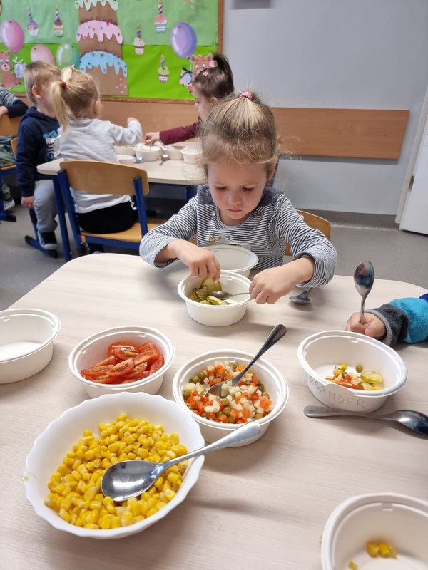 Niedawno w naszym przedszkolu przeżywaliśmy tydzień owoców oraz tydzień warzyw. Z tej okazji przedszkolaki miały możliwość zrobić własny sok. Maluszki i średniaki zrobiły sok marchewkowo- jabłkowy, a starszaki zaszalały i do swojej kompozycji dodały jeszcze pomarańczę oraz kilka warzyw. Soki były przepyszne co potwierdzili nasi mali smakosze podczas degustacji. Tydzień warzywny uczciliśmy na różne sposoby, maluszki przyrządziły sałatkę jarzynową, średniaki wykorzystały warzywa do wykonania pracy plastycznej w formie pieczątek. Wszyscy świetnie się bawili, bo przecież o to chodzi w przedszkolu.