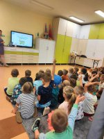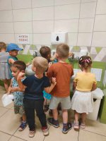 Wizyta pani pracującej w Sanepidzie w Krapkowicach w przedszkolu przyniosła radość i cenne lekcje dla najmłodszych. Pani prowadząca miała ważne zadanie - nauczyć dzieci prawidłowego mycia rąk oraz podzielić się wskazówkami dotyczącymi miejsc, które często zaniedbujemy. Podczas interaktywnej prezentacji, pani opowiedziała dzieciom o znaczeniu higieny rąk i jak można uniknąć rozprzestrzeniania się bakterii oraz chorób. Najważniejszym wyzwaniem było pokazać, że mycie rąk nie musi być nudne ani trudne. Prowadząca przyniosła ze sobą specjalne mydełko zostawiające na dłoniach pieczątki, które zachęcały dzieci do prób dokładnego mycia rąk. Dzięki nim, dzieci miały okazję poznać różne techniki mycia, np. dokładne mycie między palcami, pod paznokciami i nadgarstkami. To było nie tylko pouczające, ale również zabawne. W trakcie prezentacji pani podzieliła się z dziećmi rymowanym wierszykiem, który pomagał im zapamiętać kroki mycia rąk. Każdy wers rymowanego utworu był odzwierciedleniem konkretnej czynności higienicznej. Dzieci z zapałem powtarzały i jednocześnie przestrzegały właściwych technik mycia rąk. Jedną z ciekawostek, którą dzieci usłyszały, było porównanie czasu mycia rąk do długości piosenki „Wlazł kotek na płotek”. Prowadząca wytłumaczyła, że aby dokładnie oczyścić ręce, powinnyśmy trwać w myciu tak długo, jak trwa śpiewanie tej popularnej piosenki. Było to dla dzieci atrakcyjne porównanie, które zachęcało je do dłuższego mycia rąk. Wizyta taka w przedszkolu była nie tylko edukacyjna, ale również inspirująca. Pamiętając o tych ważnych lekcjach, dzieci mogą teraz czuć się pewniej w walce z zarazkami i pomagać utrzymać zdrowie swoje i innych.
