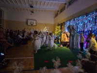 W środowy wieczór dzieci przedstawiły opowieść o narodzinach Jezusa, oprawioną wieloma pastorałkami i kolędami. Piękna scenografia oraz stroje przedszkolaków były idealnym dopełnieniem całego przedstawienia. Mali aktorzy z ogromnym zaangażowaniem odtwarzali swoje role, prezentowali umiejętności recytatorskie, wokalne i taneczne. Za swój występ otrzymali gromkie brawa od publiczności.